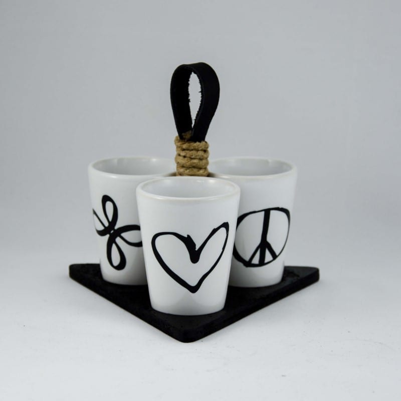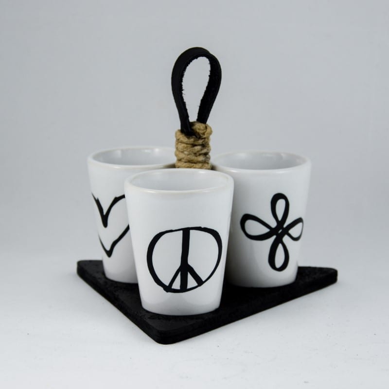 Komplet keramičnih kozarčkov "štamperlov" (45ml) s simboli za ljubezen, mir in srečo.